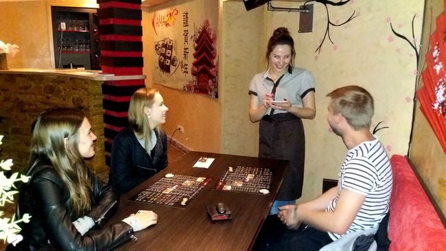 Есть барная стойка с двумя высокими стульями. Здесь у вас примет заказ очаровательная управляющая суши-баром, 27-летняя Ирина Кладкова.