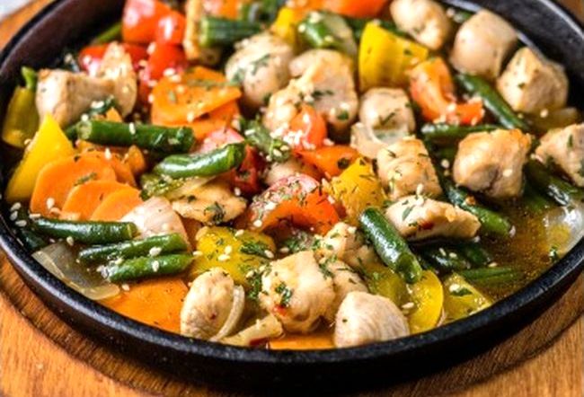Горячая сковородка с курицей. Состав: картофель, курица, спаржа, болгарский перец, морковь, лук, сливки, шампиньоны