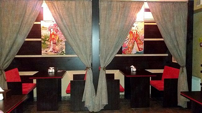 В центре - на стене роспись в виде веточек цветущей сакуры и большой красный веер.
