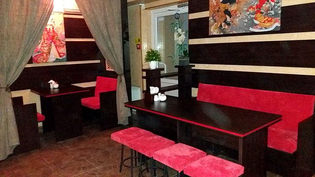 Интерьер уютного суши-бара выполнен в традиционных японских красно-черных цветах и коричневых тонах.
