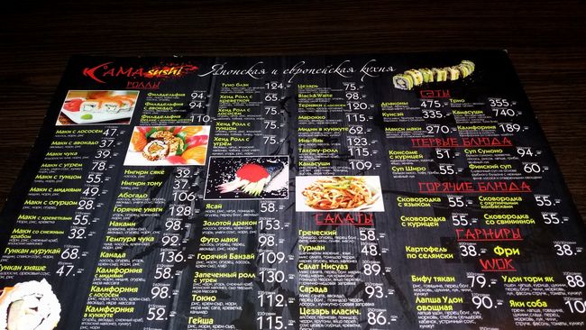 В «Камасуши», как оказалось, готовят не только блюда японской кухни, но и некоторые из европейской. Из японской - в меню большой выбор всевозможных роллов, суши, сетов. Есть первые блюда в японском стиле: Консоме с курицей (51 -), Суп Широ (55 -) и Суп Сумоно (94 –), блюда WOK с традиционной гречневой, пшеничной и лапшой удон и соба.