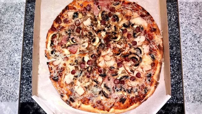 Пицца «Безумие». Состав: ветчина, колбаски охотничьи, курица копченая, соус, шампиньоны, сыр моцарелла.
