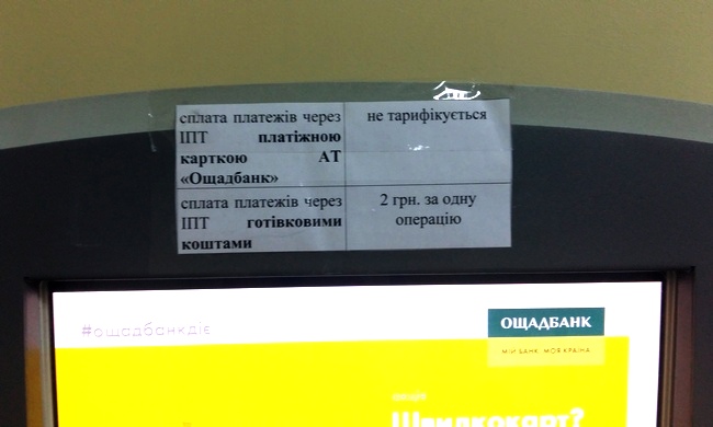 «Ощад» был единственным банком, где, через терминалы самообслуживания, можно было оплатить коммунальные услуги без комиссии, и это даже при том, что плательщик не являлся клиентом банка. Но с мая месяца появившиеся объявления на терминалах огорчит многих, кто оплачивал коммуналку таким способом. Теперь при оплате коммунальных услуг за наличные средства одна квитанция стоит 2 грн. Но если у вас имеется карта банка, то услуги оплатить можно с помощью нее и операции с платежами тарифицироваться не будут.