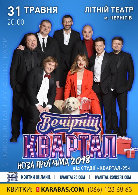 Студия «Квартал 95» радует нас новой весенней программой. Главные комики страны готовы вас смешить. Владимир Зеленский, Евгений Кошевой, Юрий Крапов и все любимые «кварталовцы» у нас в Чернигове. Новые образы, свежие шутки, актуальные пародии, - все это в одном неповторимом концерте.