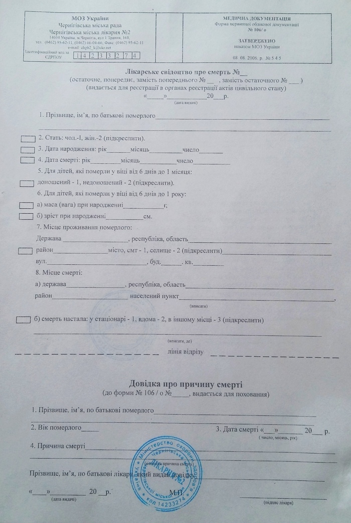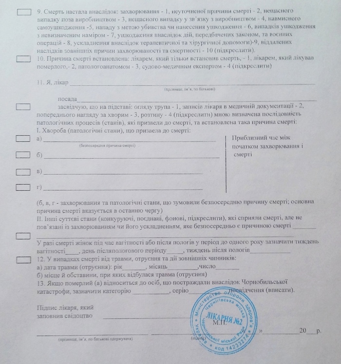 Свидетельство о смерти состоит из 13-ти пунктов, заполняется врачом поликлиники.