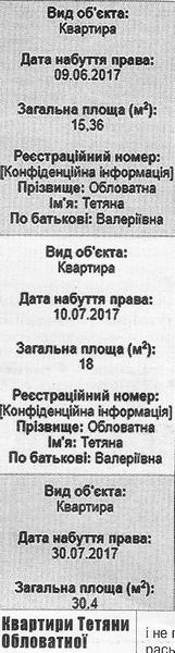 У декларації, розміщеній на сайті Національного агентства з питань запобігання корупції, Тетяна Обловатна задекларувала у 2017 році будинок площею 90,2 квадратних метра, власником якого є третя особа. Будинок придбано у жовтні 2013 року і вказано його оціночну вартість 1 мільйон 163 тисячі гривень. У тому ж таки 2013 році придбана земельна ділянка. А от у 2017 році Тетяна Обло-ватна задекларувала чотири квартири,три з яких оформила на себе і одну - на свого неповнолітнього сина.