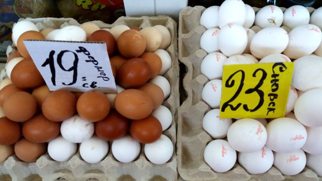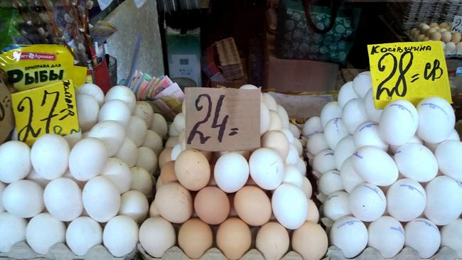 Если учитывать, что перед Пасхой на Центральном десяток куриных яиц стоил 35 гривен, то сейчас цены существенно снизились и колеблются от 19 до 28 гривен в зависимости от категории (столовое или диетическое) и массы (1,2,3, О – отборное, В – высшей категории. Категория «СВ» - столовое яйцо высшей категории.