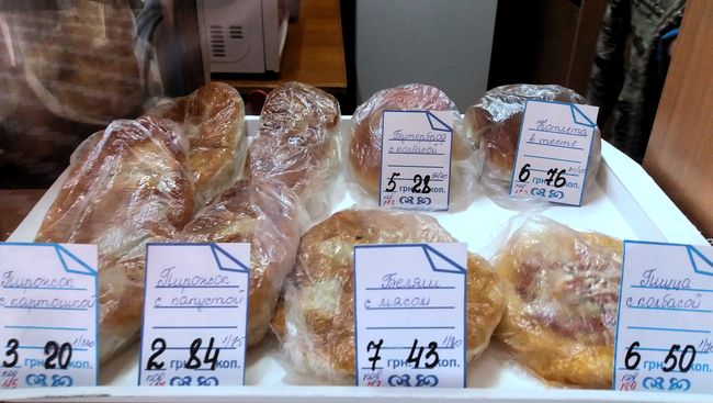 Можно перекусить просто булочкой с кофе (5.61), а можно - по минимуму, взяв, например, мясной салат (4.92), вареники с творогом и сметаной (5.17) и чай с сахаром (1.39). Такой обед обойдется в 11.48 гривен.