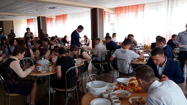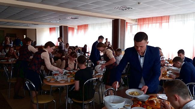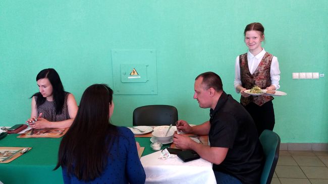 В ЧВПУБО учащиеся и преподаватели производственного обучения обедают с 11:00, а теоретического - с 11:50. Причем, учащиеся, которые выбрали свою будущую профессию, обслуживают преподавателей в качестве официанта.