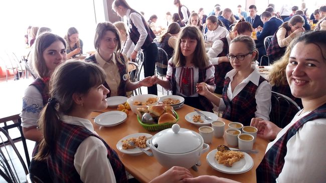 Зал столовой находится на 2-м этаже и рассчитан на 180 посадочных мест. Эта столовая покорила не столько чистотой и интерьером, сколько культурой, дружелюбием и традициями своих воспитанников.