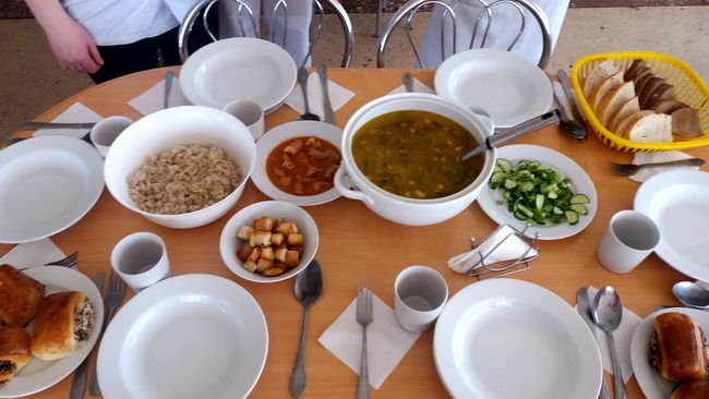 В другой день на обед повара приготовили: салат из свежих огурцов, овощной суп со сметаной, перловую кашу, гуляш, сухарики и булочки с маком.
