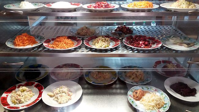 Сегодня в меню предлагается 4 вида салата и свекольная икра, суп картофельный с гречкой, 3 мясных блюда и одно рыбное, 2 вида гарниров, мучные блюда (вареники с разными начинками и пельмени). Также, есть хлеб и напитки: компот, чай, кофе.