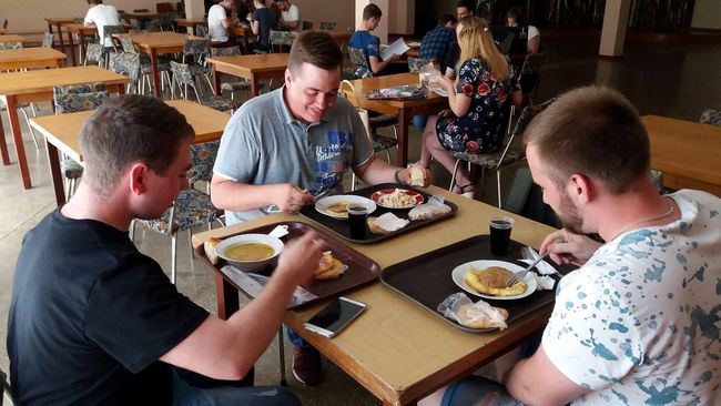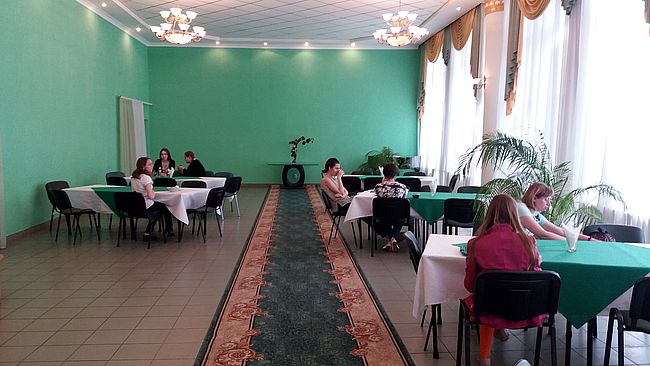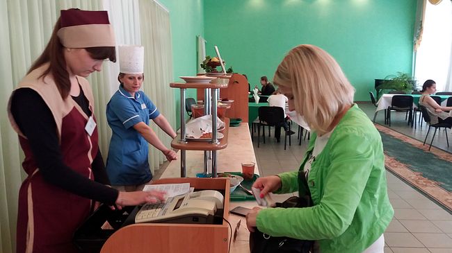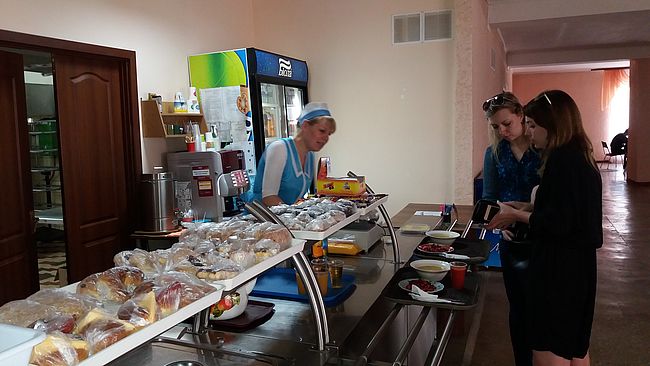 Университетская столовая представляет собой светлый просторный зал, в центре которого - место раздачи блюд. С одной стороны – эстрада, зеленые растения в декоративных вазонах, с другой – обеденные столы. Заведующая производством Валентина Александровна Смоляр рассказала, что столовая рассчитана на 150 посадочных мест. Каждый день обеды готовят 5 поваров и 2 кондитера.