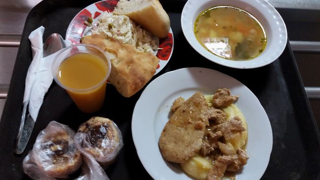 Сегодня можно было заказать на обед салат «Зимний» (2.75 грн./100 г), суп полевой (2.30 грн./250 г), гречневую кашу (2.44 грн./100 г) с мясной котлетой (5.83 грн./50 г) и сок (3.70/200 г). Итого: 17 гривен.