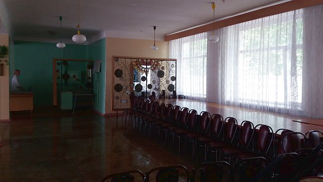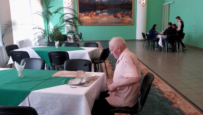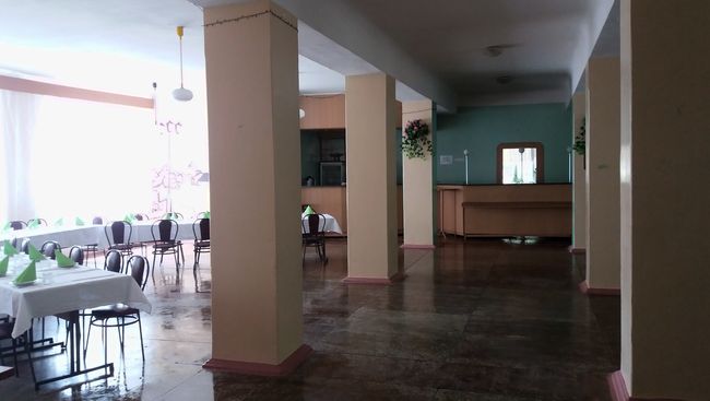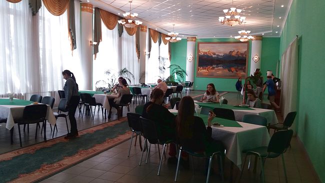 Здесь находится, пожалуй, самая красивая столовая в городе. Это светлый просторный зал со столами, накрытыми скатертями, огромной картиной на стене, массивными театральными люстрами и ковровой дорожкой на полу, да еще и стоящим в углу роялем.