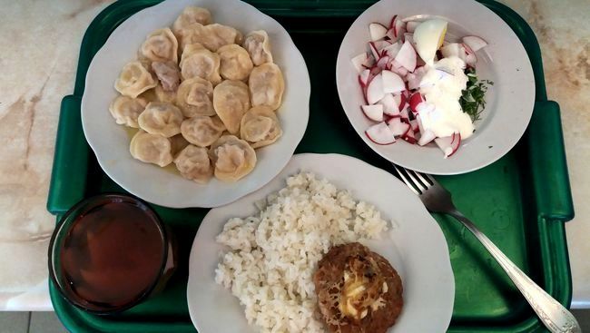 Полноценный обед, в который входят пельмени с мясом и маслом (7.44), салат из редиса с яйцом и сметаной (4.25), рис отварной (1.74) с запеченным биточком (9.25) и компот (1.36) стоит 24 гривны.