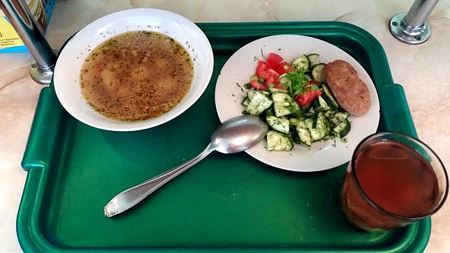 Обед из супа фасолевого, винегрета, риса отварного с куриной котлетой, куска лепешки лочира и стакана сока обойдется в 22.84 гривен.
