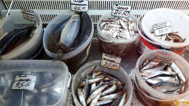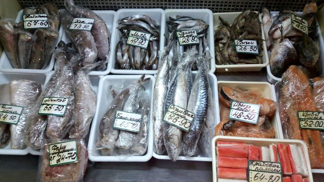 В одном из рыбных павильонов есть небольшой выбор свежезамороженной и соленой рыбы. Копченой нет.