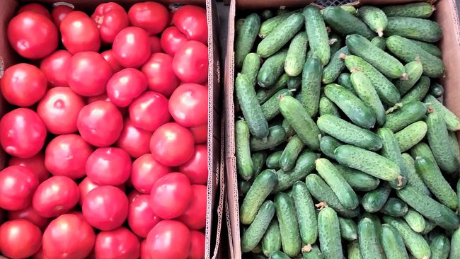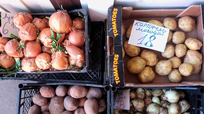 Из овощей – большой выбор разных сортов помидоров и огурцов. Появилась в продаже молодая картошка из Херсонской области.