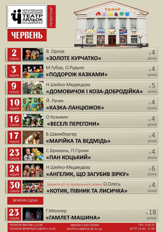 Репертуар Черниговского областного театра кукол имени Довженко на июнь 2018 года: