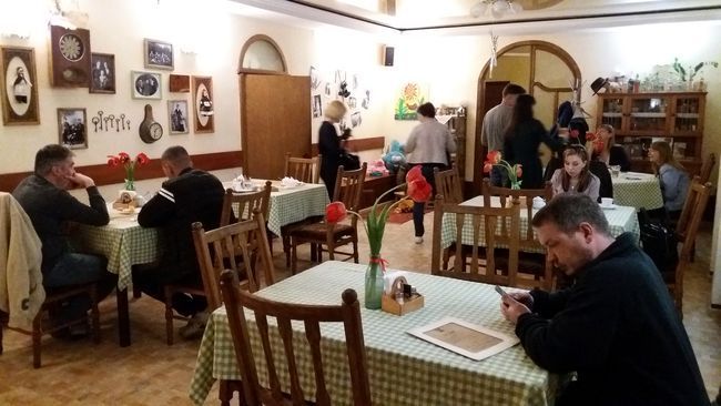Также, в зале кафе много разных настенных часов с боем и без, и даже часы с кукушкой.