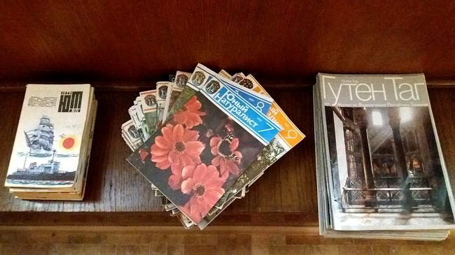 На низких полочках – зачитываемые когда-то до дыр журналы «Юный техник» и «Юный натуралист». А кто-то из гостей подарил целую подписку журналов из Федеративной Республики Германии «Гутен Таг».