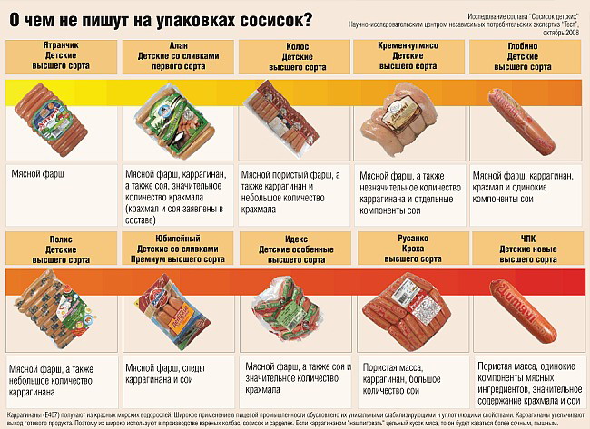 Но наш вопрос - «Что кладут в колбасу и сосиски?». Единственные независимые исследования, которые мы разыскали, проводил в прошлом и позапрошлом году Научно-исследовательский центр независимых потребительских экспертиз «Тест».