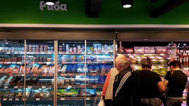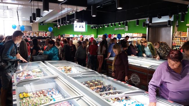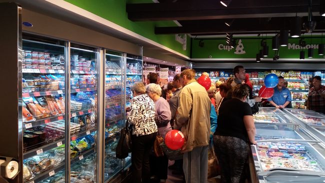 В рыбном отделе вся продукция находится за раздвижным стеклом. При желании покупатель может раздвинуть стеклянную дверь, как в купе, и выбрать товар.