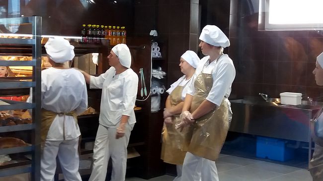 Непосредственно за ним находится мини-пекарня, и повара-кондитеры отправляют свежую выпечку прямо на витрины.