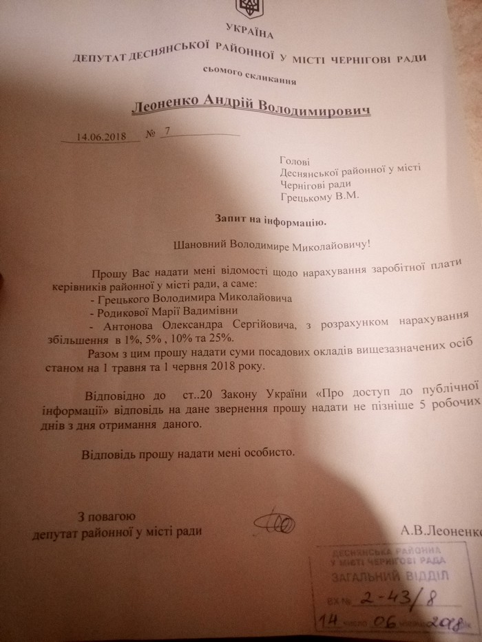 Gorod.cn.ua звернувся до голови Деснянської райради, з проханням прокоментувати інформацію від Андрія Леоненка, щодо зазначеної вище надбавки.