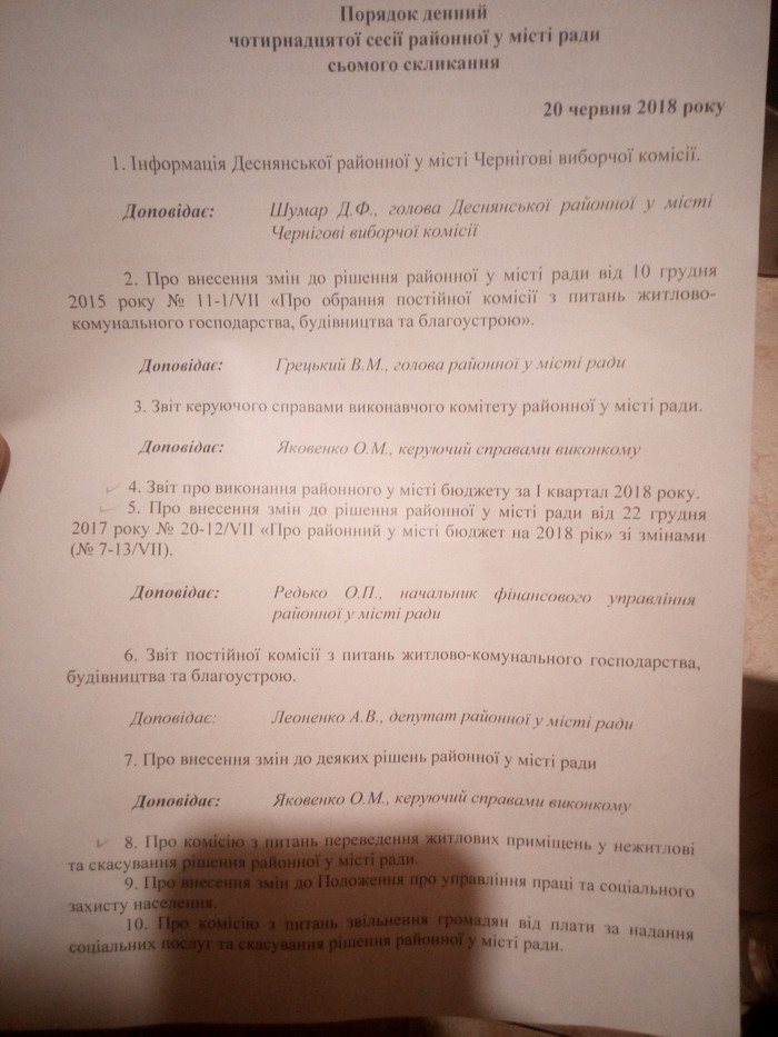 В редакцію Gorod.cn.ua звернувся депутат районної Деснянської ради Андрій Леоненко. Він повідомив, що на сесії ради, яка відбудеться 20 червня о 10.00 буде розглядатися питання №7 «Про внесення змін до деяких рішень районної у місті ради». В цьому питанні будуть розглядати установлення надбавки у розмірі 25% за високі досягнення у праці голові районної у місті ради Грецькому Володимиру Миколайовичу та його двом заступникам - Родиковій Марії Вадимівні та Антонову Олександру Сергійовичу.