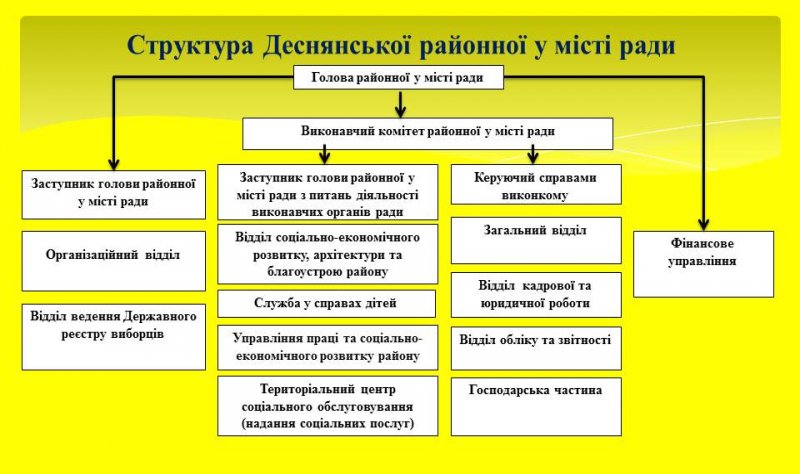 Апарат Деснянської райради нараховує 36 чоловік, це включаючи 2 водіїв легкових автомобілів, 1 двірника, 3 прибиральниці та завгоспа. Також входять в структуру ради входять: Фінуправління (8 чоловік), Служба у справах дітей (10 чоловік), Управління праці та соціального захисту населення (125) і Територіальний центр соціального обслуговування (надання соціальних послуг Деснянської райради) - 130 штатиних одиниць. Зарплата всіх цих людей обмежується рамками фонду заробітної плати, за який ми не можемо вийти.