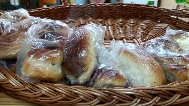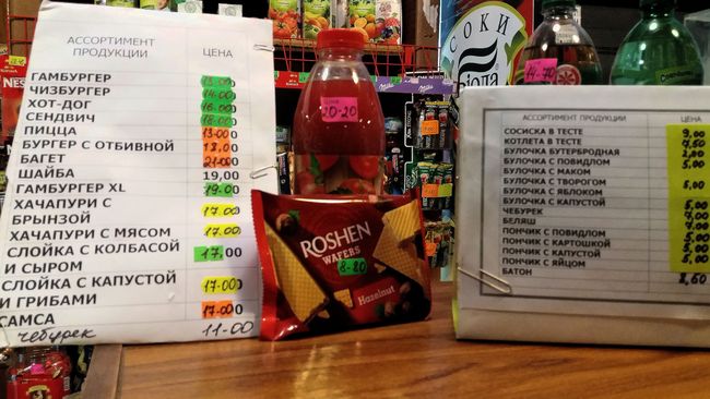 В ассортименте разные булочки и пончики по цене от 5 до 9.50 гривен и то, что можно съесть горячим или разогретым в микроволновке: чебуреки, гамбургеры, хот-доги, пицца, хачапури с брынзой, слойки с колбасой, сыром, капустой, грибами. Цена – от 11 до 21 гривны.