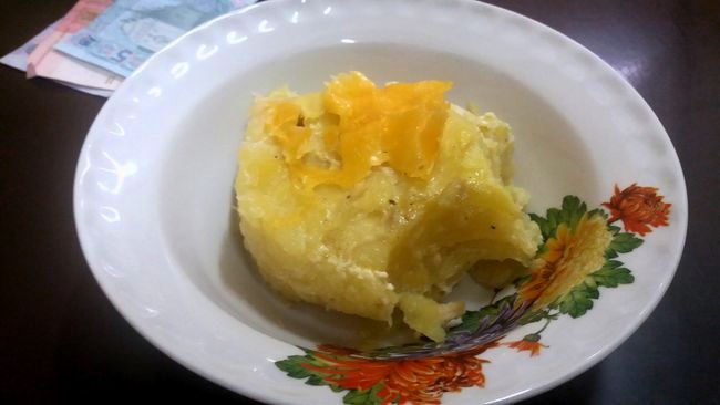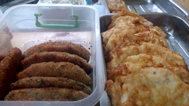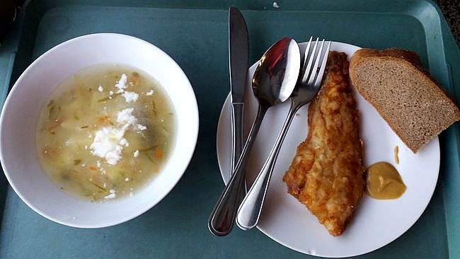 Но можно перекусить и за 27.45 гривен, но без салата и гарнира: рассольник (6.10/250 г), рыба жареная (15.60/100 г), узвар (5.00) и кусочек хлеба (0.75).