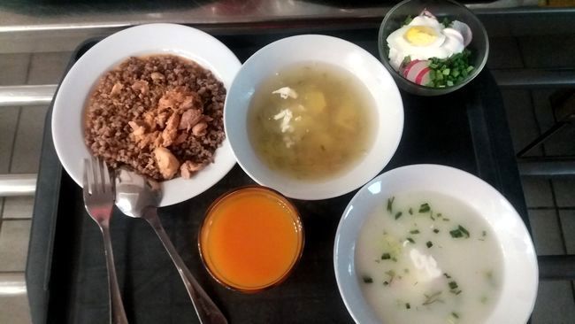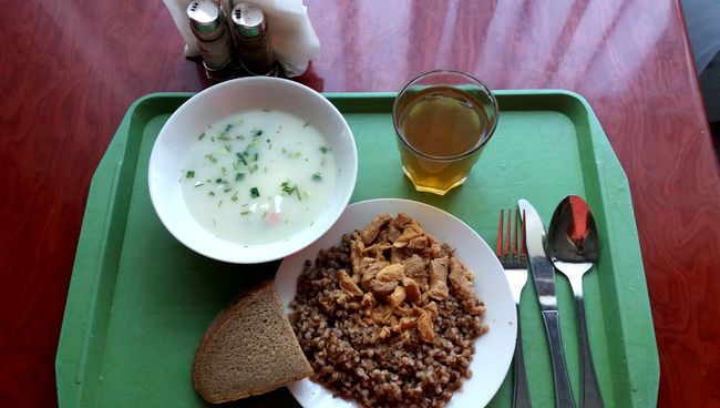 Мы взяли на обед прохладную окрошку, гречневую кашу с поджаркой и компот из сухофруктов. Всё вполне «съедобно» и сытно. Итого, обед без салата обошелся в 32.80 гривен.