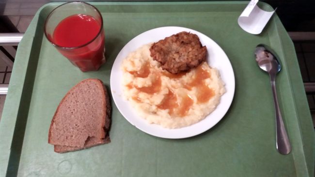 Две порции картофельного пюре (5.70*2), биток Украина (14.85), кусочек хлеба (0.75) и томатный сок (7.00) стоят 34 гривны.