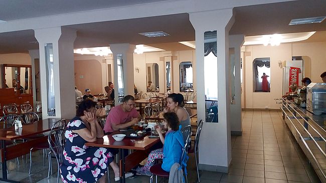 Столовая просторная, светлая, рассчитана на 80 посадочных мест. На каждом столике салфетки и приборы с солью и перцем.
