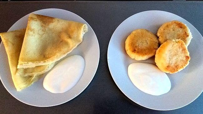 Также, есть сырники со сметаной и блинчики с разными начинками.