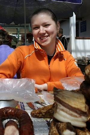 Мы сами из Киенки. Сюда, на базар, пришли лет восемь или девять назад. Тогда как было: мама, папа, нас трое детей, а денег нет... Зато было 18 свиней. Вот мы и начали пробовать готовить. Труднее всего было правильно подобрать рецептуру, а то ведь сделаешь партию — а оно то недосоленное, то пересоленное... Вы представить себе не можете, сколько «неправильного» приходилось самим есть! Но все же не осилишь — целыми тазиками собакам отдавали. Да и условия не такие были: коптили мы колбаски да балычки в старом приспособлении — бочка, костер. Это уже недавно электрической коптильней разжились. Сейчас своих свиней мы не держим — покупаем домашнее мясо в селе. В неделю делаем и продаем в среднем 50 килограммов продукции, и еще двоих людей нанимаем.