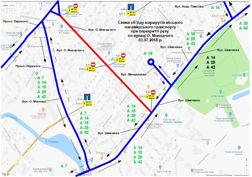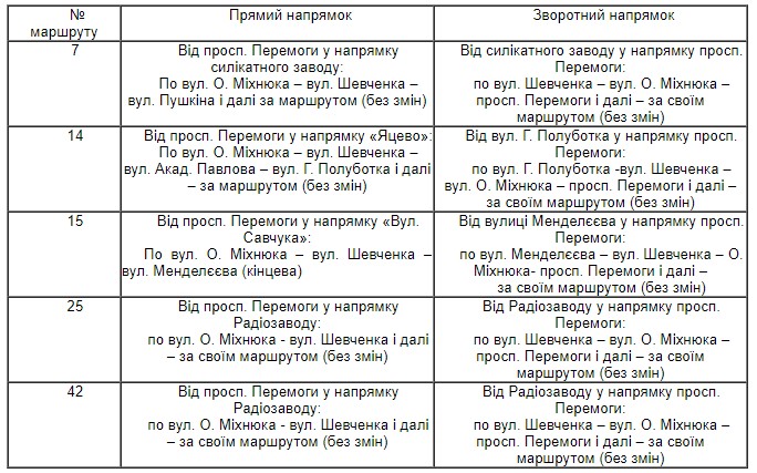 Вносяться зміни до схем руху міських маршрутів № 7, 14, 15, 25, 42 автобуси проїжджатимуть вказану ділянку таким чином:
