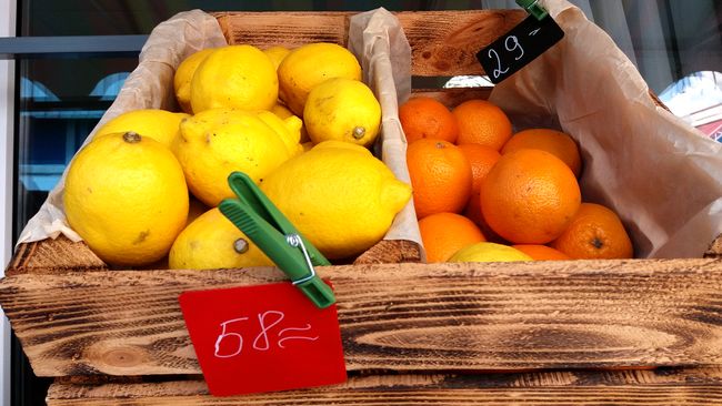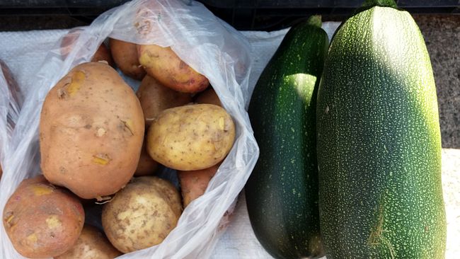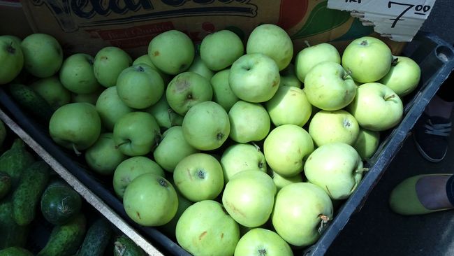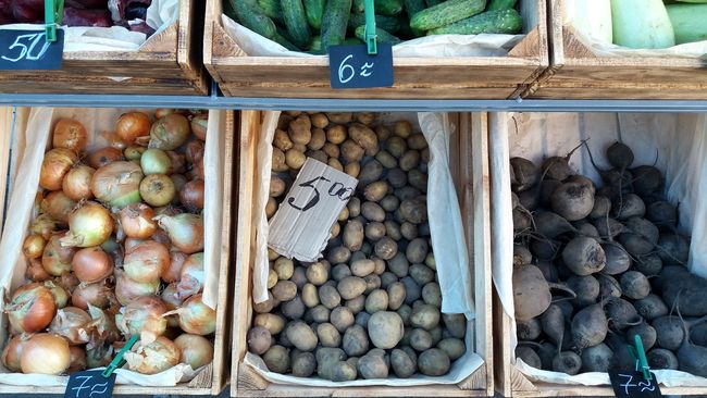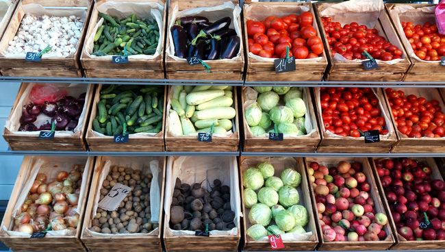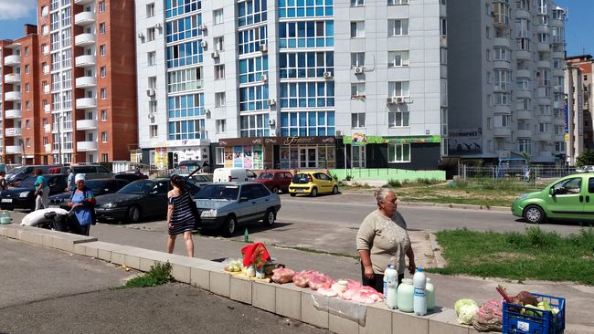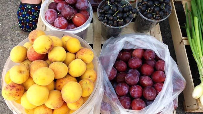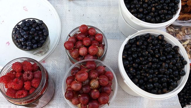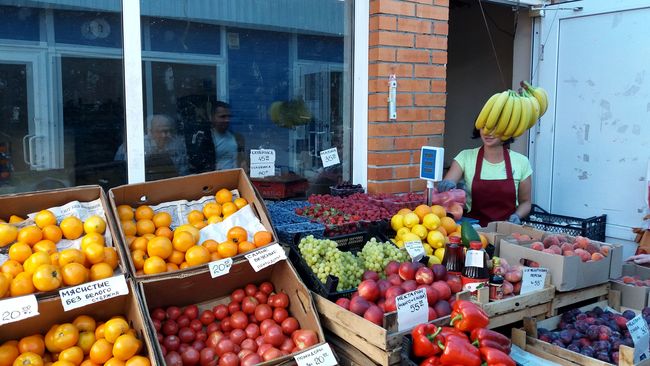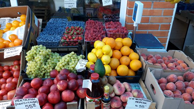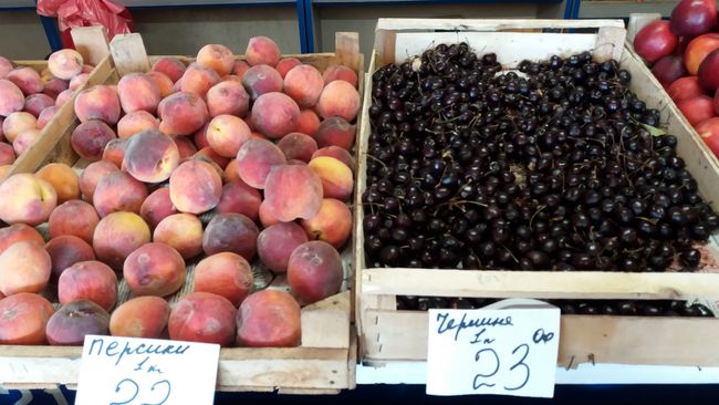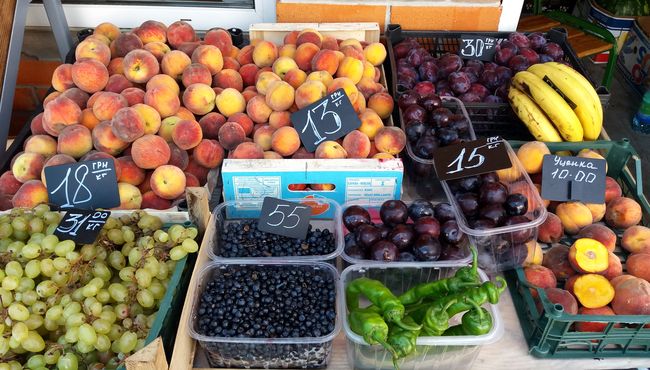 На дворе - середина июля. Поэтому, на фруктово-овощных раскладках – дары природы на любой вкус из южных регионов Украины, в основном из Херсонской и Одесской областей. Созрели уже дыни, арбузы, виноград, яблоки «белый налив». В большом ассортименте персики. Цены в зависимости от сорта, размера – от 23 до 37 гривен за килограмм. Есть в продаже клубника из Ягодного и Закарпатская голубика, тропические авокадо и киви. Из цитрусовых – турецкие лимоны и апельсины.