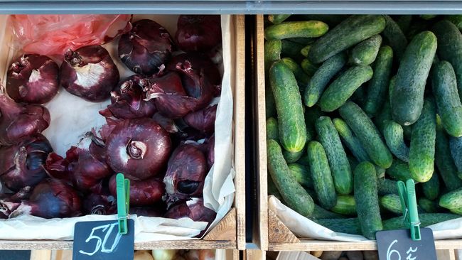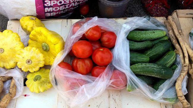 Что касается цен, помидоры продают в среднем от 18 до 23 гривен, а вот цена на огурчики упала, и их продают всего по 6 грн. за кг. Цена на баклажаны снизилась от 20 до 12 гривен.