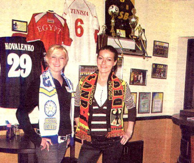 — Юрий Юрьевич часто бывает, с братом, — говорит Наташа. — Мы в такие дни футболки одеваем, одна, допустим, «Динамо», другая — «ЦСКА». Вот сегодня футбол будет, «Динамо» — «Шахтер», готовимся. В такие дни есть специальное фан-меню. Большую пиццу по 18 гривен в обычные дни не готовят (готовятся поменьше.) Фан-меню — это 200 г картофеля-фри, две колбаски или сосиски и либо морковка, либо другие овощи (помидоры, допустим). Стоит все 15 гривен. Кафе не закрывается, пока не окончится матч.