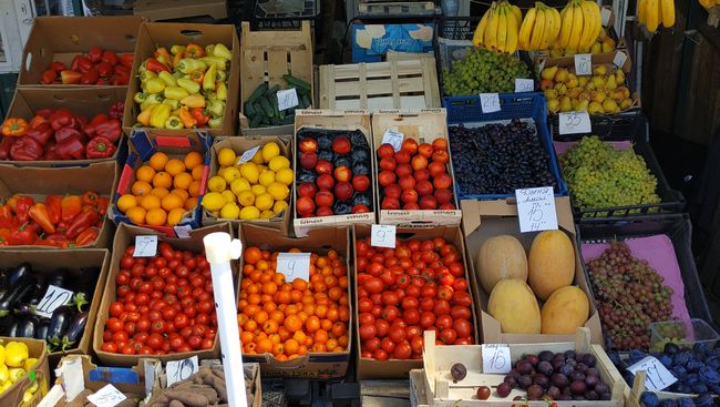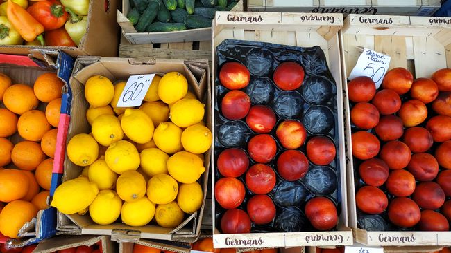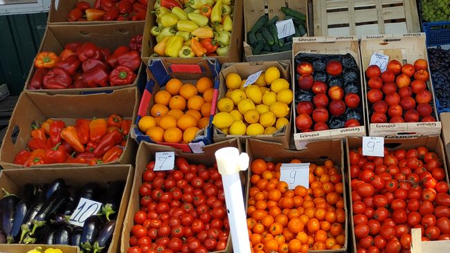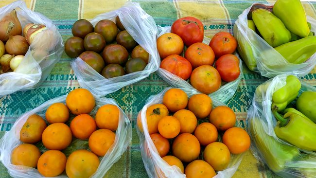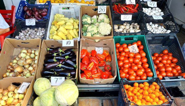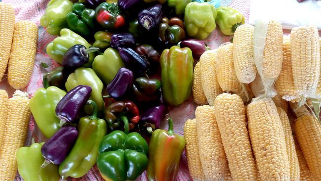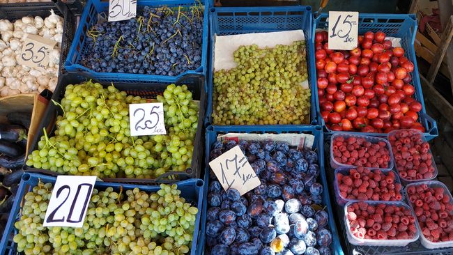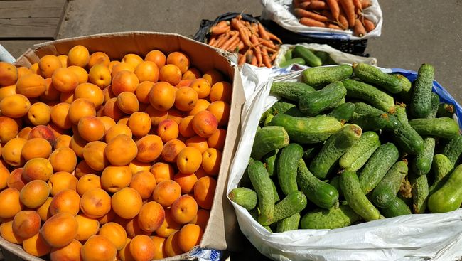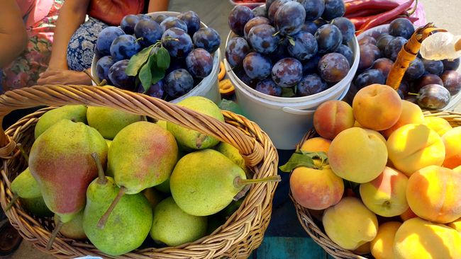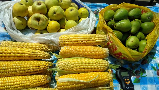 Август – самое время для консервации. Домашние маленькие огурчики продают от 15 до 20 гривен. Побольше размером – от 7 до 10 гривен. В изобилии зелень: укроп, петрушка, кинза, зеленый и фиолетовый базилик. Из овощей - молодая картошечка и хрустящая морковка, красные и желтые помидоры, зеленые и желтые кабачки, репчатый лук и сахарная кукуруза.