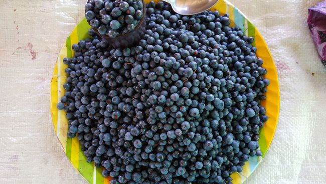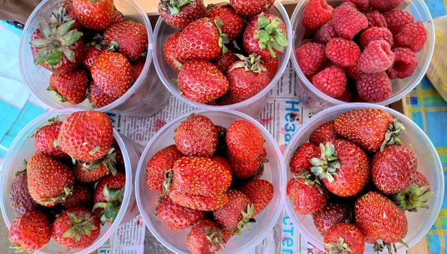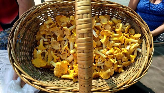 На прилавках также - черника, красная и желтая алыча, персики и сливы, яблоки и груши, выращенная в своих огородах малина и клубника поздних сортов, собранные в лесу лисички.