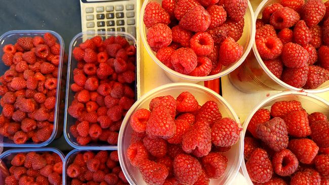 Малина (сорт Поляна) 15 грн. за стаканчик, 25 – за лоток
