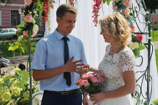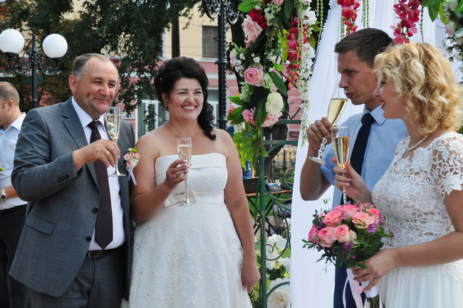 Торжественную церемонию бракосочетания провела государственный регистратор Елена Черня. А дальше – поздравления и подарки, бокалы с шампанским, загадывание желаний и фотографирование на память.