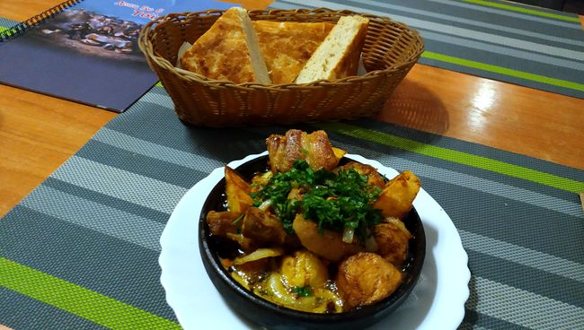 Таким образом, предварительно убедившись, что грузинские блюда готовят настоящие повара-грузины, а украинские – наши повара, мы выбрали Оджахури по-грузински (запеченный картофель с мясом и луком с зеленью и специями, 85 грн./300 г) и Купаты (колбаски из рубленого мяса с добавлением большого количества специй 90 грн./200 г). К ним - кисло-сладкий соус сацебели, свежий грузинский хлеб и компот, тоже, по-грузински.