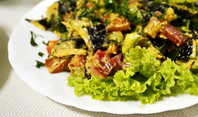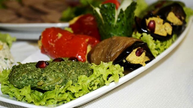 Ассорти из баклажанов и перцев с ореховой заправкой, украшенные ягодами граната 125 грн./300 г