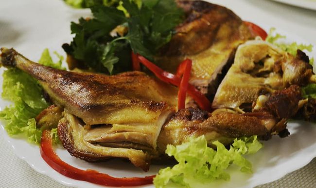 Затем следуют салаты, первые и вторые горячие мясные, рыбные, овощные блюда. Есть знаменитый цыпленок табака, суп харчо, чахохбили и чашушули, лобио, несколько видов хачапури и др.